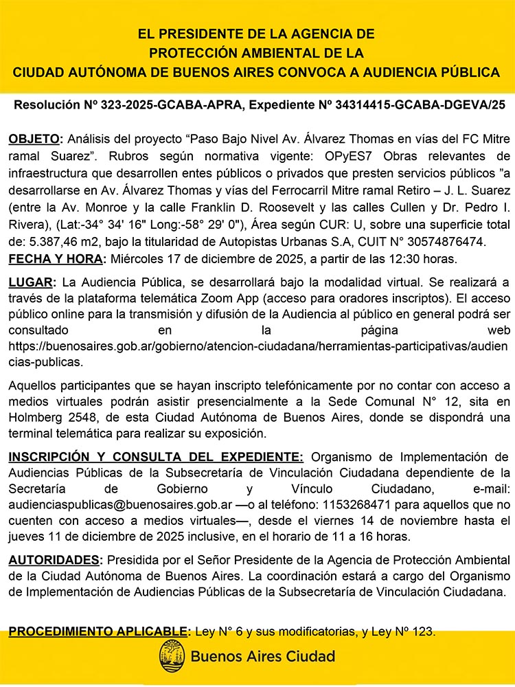 Convocatoria a Audiencia Pública para tratar proyecto Paso Bajo Nivel Álvarez Tomás en vías del Mitre-Ramal-Suárez12 noviembre, 2025 Compartir Compartir