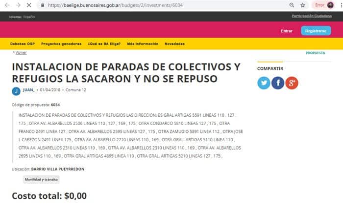 Un dato curioso es que hubo un proyecto con 0,00 pesos asignados. Se trata de la “instalación de paradas de colectivos y refugios”. La propuesta detalla las arterias de donde se sacaron y nunca se repusieron, y a que líneas corresponderían.