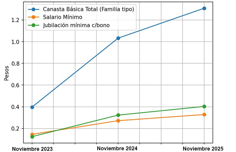 Por otro lado, la jubilación mínima con bono pasó de $124.460 en noviembre de 2023 a $403.053 en noviembre de 2025 con un aumento de 224%. En noviembre de 2025 cubría el 113,5 % de la canasta alimentaria de una pareja de adultos mayores y el 62% de la canasta básica total, mientras que en el mismo mes de 2023 la relación era del 108 % y del 64,6% respectivamente.